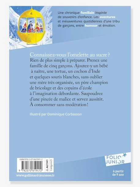 Connaissez-vous l’omelette au sucre ? Rien de moins compliqué à préparer. Prenez une famille de cinq garçons. Ajoutez-y un nouveau bébé à naître, une tortue, un cochon d’Inde et une poignée de souris blanches. Mélangez bien le tout, sans oublier une mère très organisée, un père champion du bricolage et quelques copains d’école à l’imagination débordante. Saupoudrez d’une pincée de malice et d’émotion, et servez aussitôt. C’est prêt… À consommer sans modération !