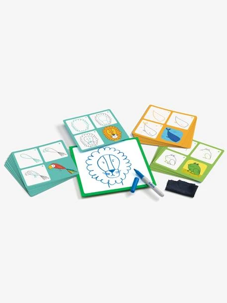 o Comprend : Contient 12 cartes recto-verso (15 x 15 cm), 1 planche effaçable et 1 feutre effaçable à sec. 1 chiffon.